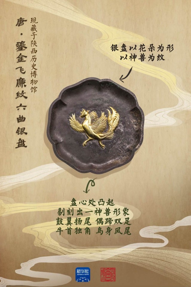 1970年10月,在西安市南郊何家村的工地上,施工人員偶然發(fā)現(xiàn)了一處文物窖藏,隨后在這里清理出千余件唐代珍寶。這件鎏金飛廉紋六曲銀盤制作考究、工藝典雅、紋飾獨特,盤心的神獸形象為飛廉,是中國古代神話傳說中的風(fēng)神。這件銀盤構(gòu)圖借鑒了中亞粟特的藝術(shù)手法,但題材卻是中國紋樣,反映出唐代工匠在借鑒西方金銀器藝術(shù)的基礎(chǔ)上,更加注重推陳出新。