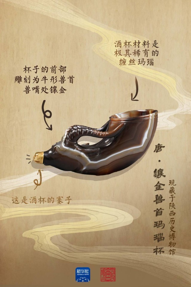 這件鑲金獸首瑪瑙杯,被列為我國禁止出境的珍貴文物之一。角狀杯體由一整塊極為罕見的紅色纏絲瑪瑙雕琢而成,整個杯體高6.5厘米,長15.6厘米,口徑5.6厘米,其造型與起源于古希臘的酒具“來通”相似,“來通”曾廣泛流行于中亞、西亞地區(qū),沿著絲綢之路不斷東傳進入中國。