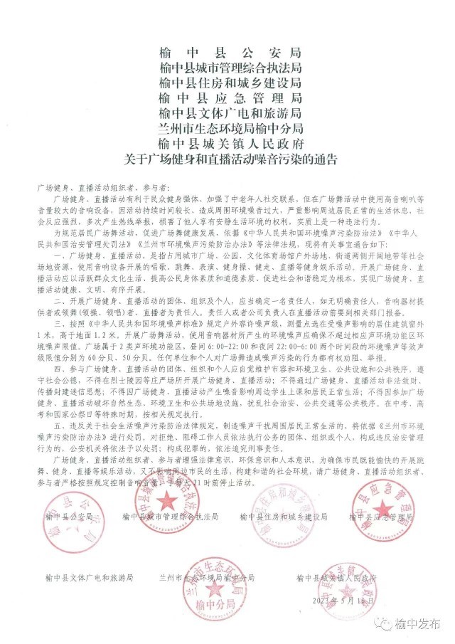 日前,蘭州市榆中縣公安局、榆中縣城市管理綜合執(zhí)法局等單位聯(lián)合發(fā)布《關(guān)于廣場(chǎng)健身和直播活動(dòng)噪音污染的通告》(以下簡(jiǎn)稱《通告》),其中明確,當(dāng)?shù)貜V場(chǎng)健身、直播活動(dòng)組織者參與者嚴(yán)格按照規(guī)定控制音響音量,于每天21時(shí)前停止活動(dòng)。