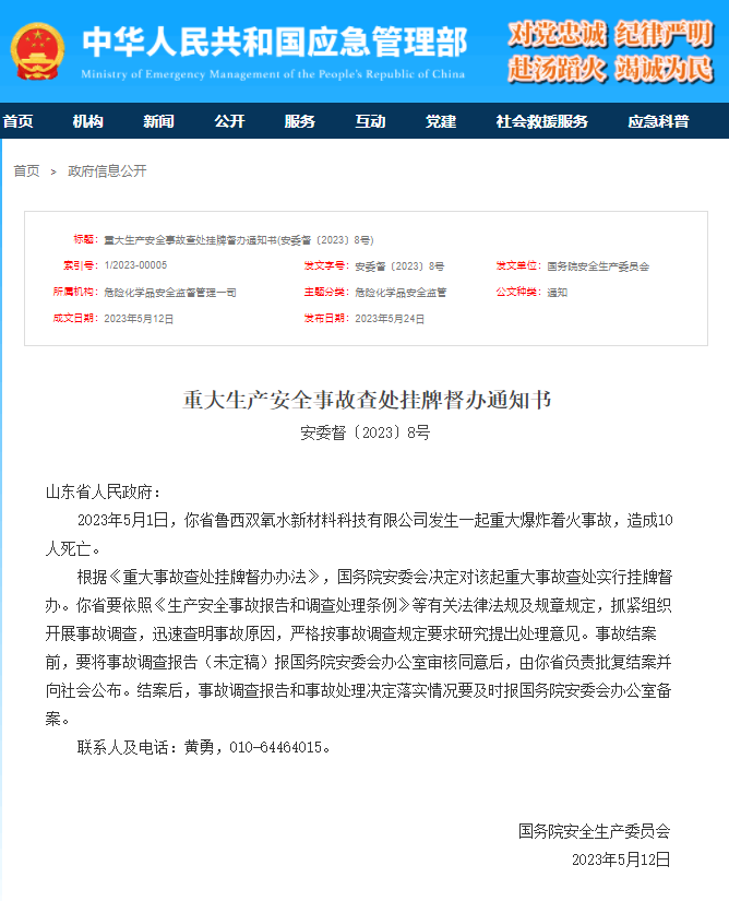 據(jù)應(yīng)急管理部消息,5月24日,國(guó)務(wù)院安全生產(chǎn)委員會(huì)發(fā)布重大生產(chǎn)安全事故查處掛牌督辦通知書(shū)。
