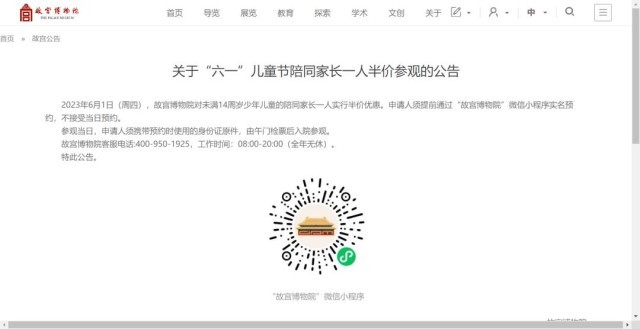 故宮:“六一”帶未滿14歲兒童參觀,一名家長(zhǎng)半價(jià)