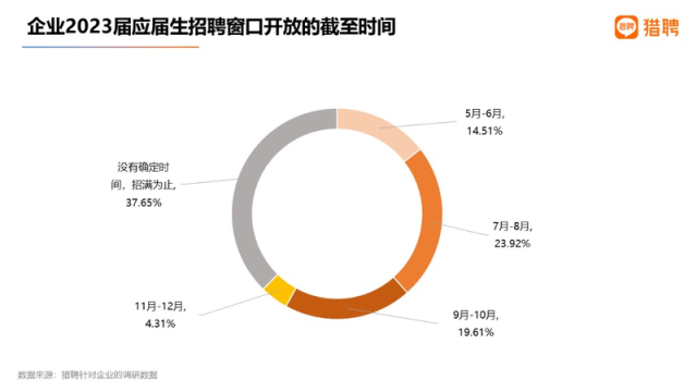 據(jù)了解,2023屆高校畢業(yè)生規(guī)模預(yù)計1158萬人,同比增加82萬人。本次調(diào)研中,有37.65%的企業(yè)表示校招窗口期“沒有確定截止時間,招滿為止”,23.92%的企業(yè)表示“最晚到7-8月”,19.61%的企業(yè)把期限定為9-10月。