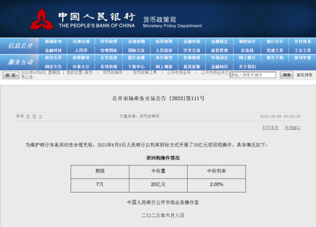 據(jù)央行官網(wǎng)消息,為維護銀行體系流動性合理充裕,2023年6月8日中國人民銀行以利率招標(biāo)方式開展了20億元逆回購操作。具體情況如下: