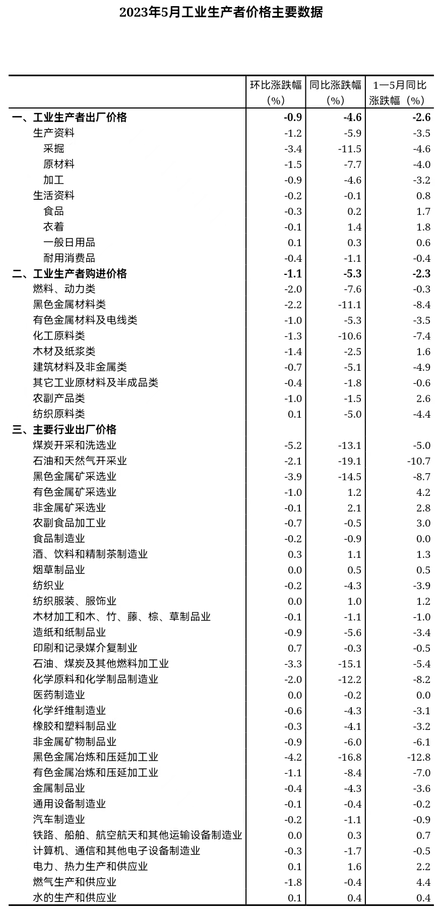 6月15日,國家統(tǒng)計(jì)局發(fā)布消息,2023年5月份,全國工業(yè)生產(chǎn)者出廠價(jià)格同比下降4.6%,環(huán)比下降0.9%;工業(yè)生產(chǎn)者購進(jìn)價(jià)格同比下降5.3%,環(huán)比下降1.1%。1—5月平均,工業(yè)生產(chǎn)者出廠價(jià)格比去年同期下降2.6%,工業(yè)生產(chǎn)者購進(jìn)價(jià)格下降2.3%。