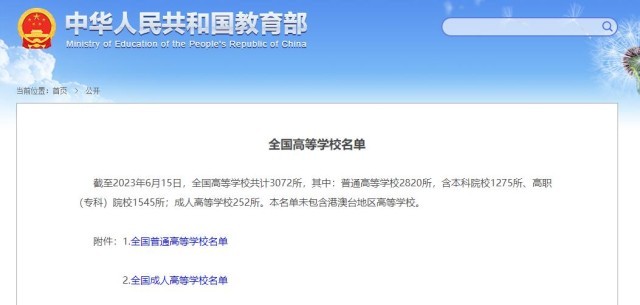 央視網消息:據教育部,截至2023年6月15日,全國高等學校共計3072所,其中:普通高等學校2820所,含本科院校1275所、高職(??疲┰盒?545所;成人高等學校252所。本名單未包含港澳臺地區(qū)高等學校。