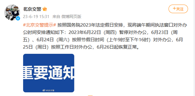 央視網(wǎng)消息:據(jù)北京交警微博消息,按照國務院2023年法定假日安排,現(xiàn)將端午期間執(zhí)法窗口對外辦公時間安排通知如下:2023年6月22日(周四)暫停對外辦公,6月23日(周五)、6月24日(周六)按照節(jié)假日時間(上午9時至下午16時)對外辦公,6月25日(周日)按照工作日對外辦公,6月26日起恢復正常。