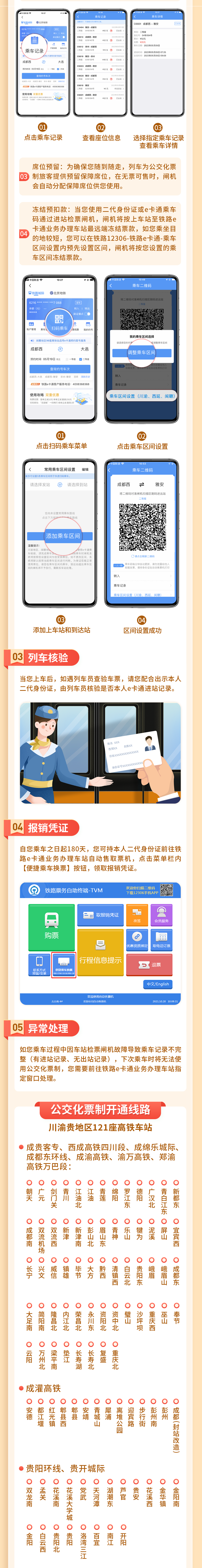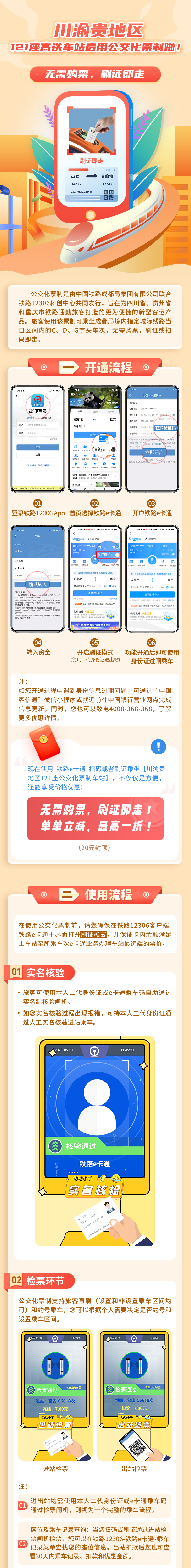 為進一步提升通勤旅客出行體驗,中國鐵路成都局集團有限公司管內(nèi)的川渝貴地區(qū)121座高鐵車站啟用公交化票制。已開通鐵路e卡通的旅客在鐵路12306客戶端-鐵路e卡通主頁,啟用刷證模式,即可使用二代身份證或e卡通乘車碼,實現(xiàn)無需購票,刷證或掃碼即走