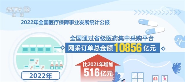 在藥品和耗材集采方面,2022年,第七批國家組織藥品集中帶量采購涉及61個品種,平均降價48%。國家組織骨科脊柱類高值醫(yī)用耗材集采納入5種脊柱類骨科耗材,平均降幅84%。根據(jù)公報,2022年,全國通過省級醫(yī)藥集中采購平臺網采訂單總金額10856億元,比2021年增加516億元。其中,西藥(化學藥及生物制品)8810億元,中成藥2046億元,分別比2021年增加495億元和21億元。群眾用上了更多質優(yōu)價宜的藥品和耗材。