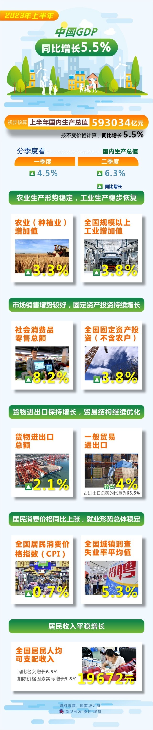 翻開半年報,國內(nèi)生產(chǎn)總值比去年同期增長5.5%,社會消費品零售總額同比增長8.2%,第三產(chǎn)業(yè)增加值同比增長6.4%……多項指標顯示,我國經(jīng)濟運行延續(xù)恢復(fù)向好態(tài)勢,同時物價、出口等部分指標增速放緩也引發(fā)關(guān)注。