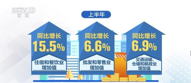 2023年上半年,我國服務(wù)業(yè)增加值同比增長6.4%,接觸型服務(wù)業(yè)較快增長。上半年,住宿和餐飲業(yè)、批發(fā)和零售業(yè)、交通運輸、倉儲和郵政業(yè)增加值同比分別增長15.5%、6.6%和6.9%。