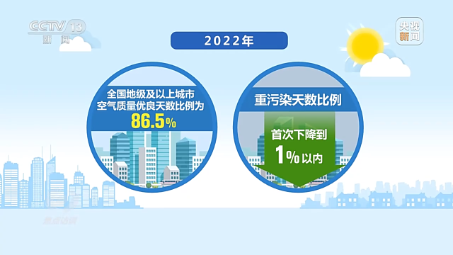 不僅北京,十年來,全國重點城市PM2.5平均濃度下降57%。2022年,全國地級及以上城市空氣質(zhì)量優(yōu)良天數(shù)比例為86.5%,重污染天數(shù)比例首次下降到1%以內(nèi)。我國成為全球大氣質(zhì)量改善速度最快的國家,藍天保衛(wèi)戰(zhàn)正在給百姓帶來實實在在的幸福感。