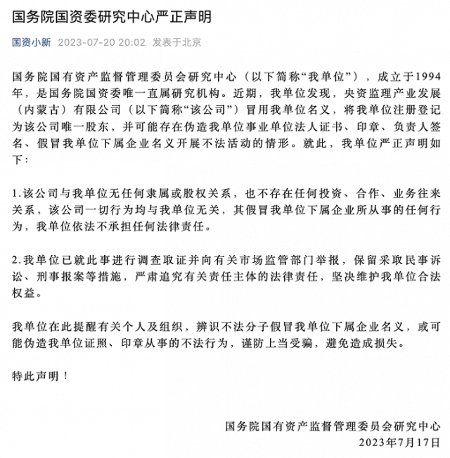 國(guó)務(wù)院國(guó)資委研究中心:一公司冒用我單位名義或開(kāi)展不法活動(dòng),已調(diào)查取證并舉報(bào)