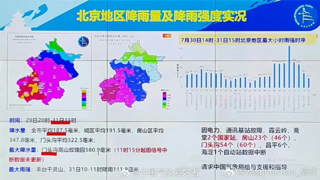 微博賬號(hào)“中國(guó)氣象愛(ài)好者”發(fā)布消息稱,北京西部大量氣象站因特大暴雨導(dǎo)致電力通信和設(shè)備故障失聯(lián) 來(lái)源:微博