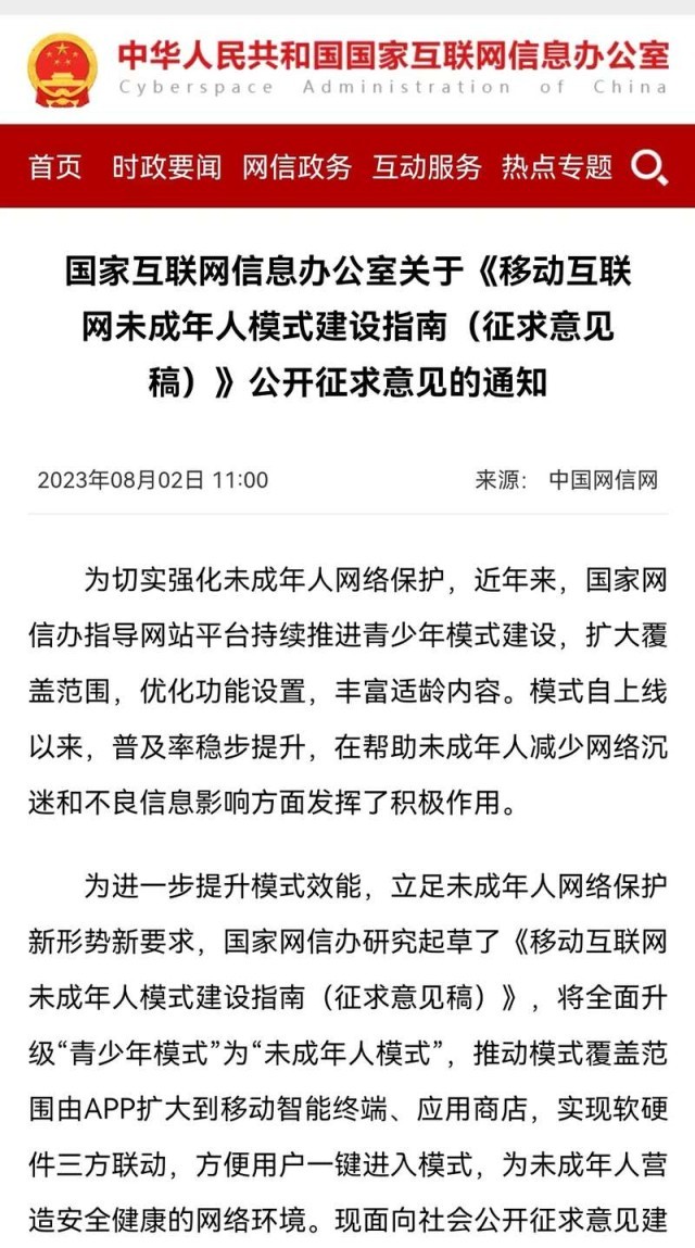近年來,為切實強化未成年人網(wǎng)絡保護,國家網(wǎng)信辦指導網(wǎng)站平臺持續(xù)推進青少年模式建設,擴大覆蓋范圍,優(yōu)化功能設置,豐富適齡內容。模式自上線以來,普及率穩(wěn)步提升,在幫助未成年人減少網(wǎng)絡沉迷和不良信息影響方面發(fā)揮了積極作用。為進一步提升模式效能,立足未成年人網(wǎng)絡保護新形勢新要求,國家網(wǎng)信辦研究起草了《征求意見稿》。