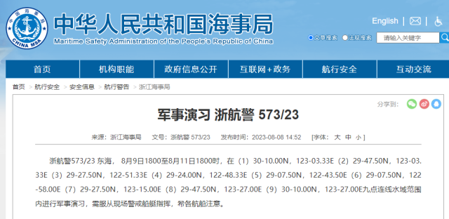 據(jù)中國海事局網(wǎng)站消息,浙江海事局發(fā)布航行警告,8月9日18時至8月11日18時,東海部分海域進行軍事演習,需服從現(xiàn)場警戒船艇指揮,希各航船注意。