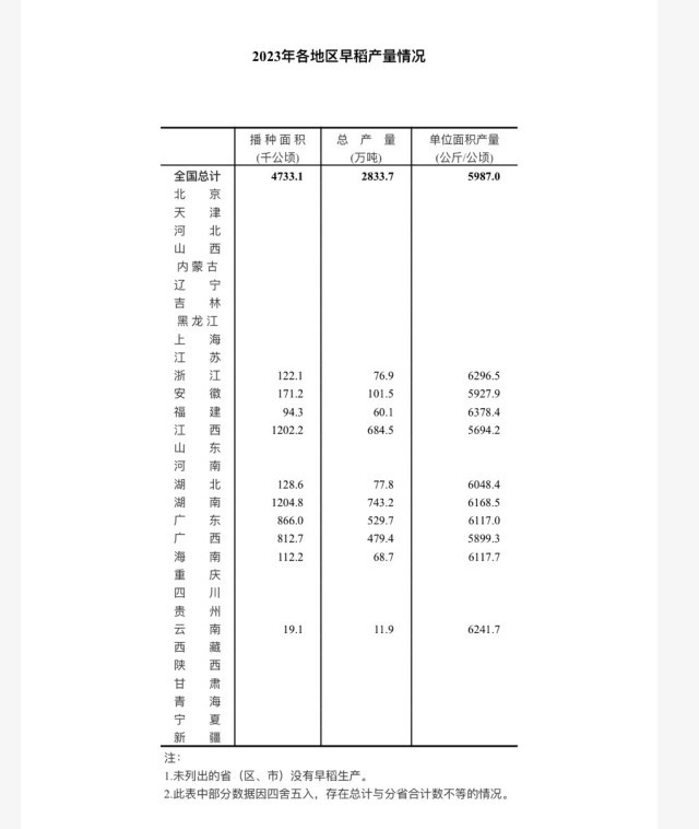 國家統(tǒng)計局今天發(fā)布數(shù)據(jù)顯示,2023年,全國早稻總產(chǎn)量566.7億斤,比2022年增加4.3億斤,增長0.8%。全國早稻播種面積7099.7萬畝,單位面積產(chǎn)量399.1公斤/畝,比2022年增加4.8公斤/畝,增長1.2%。
