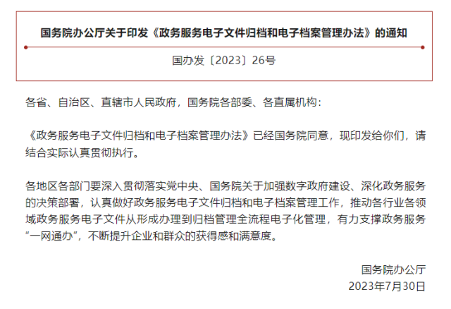 《辦法》就進一步規(guī)范政務服務電子文件歸檔和電子檔案管理,推動各行業(yè)各領域政務服務電子文件從形成辦理到歸檔管理全流程電子化,在機制和流程上提出明確要求,將有力支撐政務服務“一網(wǎng)通辦”。