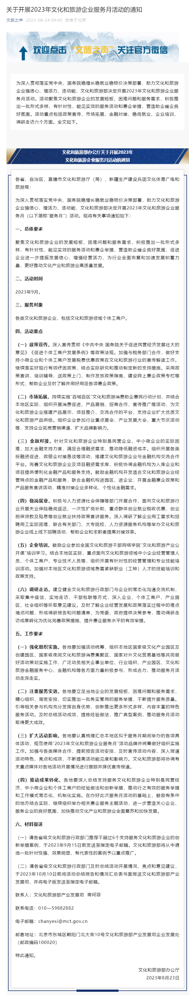 文旅部:將于9月開展2023年文化和旅游企業(yè)服務(wù)月活動(dòng)