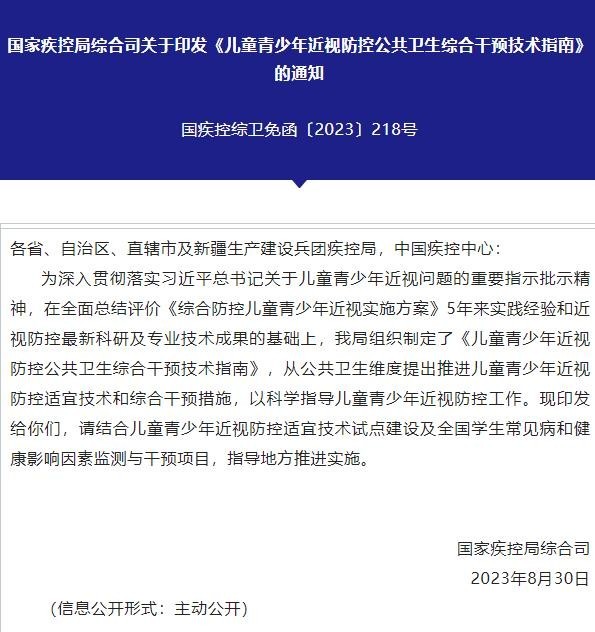 國(guó)家疾控局印發(fā)《兒童青少年近視防控公共衛(wèi)生綜合干預(yù)技術(shù)指南》