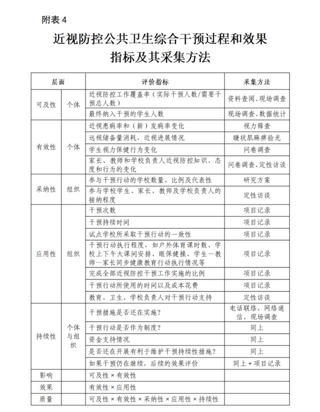 2.注重過(guò)程與效果評(píng)價(jià)。各級(jí)疾控機(jī)構(gòu)要定期開(kāi)展學(xué)生視力監(jiān)測(cè)工作,深入分析歷年監(jiān)測(cè)數(shù)據(jù),將監(jiān)測(cè)發(fā)現(xiàn)的主要學(xué)生健康問(wèn)題和建議及時(shí)報(bào)告當(dāng)?shù)卣;趯?shí)施性研究方法,從理論向?qū)嵺`進(jìn)行轉(zhuǎn)化和應(yīng)用,可推進(jìn)干預(yù)行動(dòng)的實(shí)施與傳播。進(jìn)行過(guò)程與效果評(píng)價(jià),引入實(shí)施性研究框架和理論模型,如近視防控公共衛(wèi)生綜合干預(yù)過(guò)程和效果指標(biāo)及其采集方法(附表4),從個(gè)體層面和組織層面全面評(píng)價(jià)干預(yù)行動(dòng)的可及性、有效性、應(yīng)用性、可持續(xù)性,系統(tǒng)性地評(píng)估兒童青少年近視公共衛(wèi)生綜合干預(yù)的實(shí)施成效。