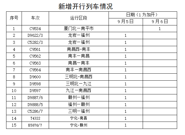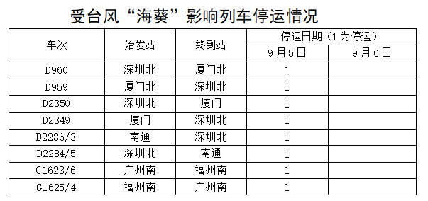 據(jù)中央氣象臺(tái)消息,今年第11號(hào)臺(tái)風(fēng)“??庇诮裉欤?月5日)早晨5點(diǎn)20分前后在福建省東山縣沿海登陸,福建東部部分地區(qū)將有大暴雨,并伴有短時(shí)強(qiáng)降水,局地有雷暴大風(fēng)等強(qiáng)對(duì)流天氣。為防范臺(tái)風(fēng)影響,保障鐵路運(yùn)輸安全,中國(guó)鐵路南昌局集團(tuán)有限公司繼續(xù)調(diào)整部分旅客列車(chē)運(yùn)行方案,停運(yùn)管內(nèi)途經(jīng)杭深線(xiàn)福州南至詔安,龍漳線(xiàn)龍巖至漳州,昌福線(xiàn)三明北至福州等區(qū)段旅客列車(chē)。同時(shí),加開(kāi)15趟旅客列車(chē),方便旅客出行。