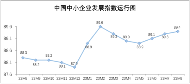 8月中國中小企業(yè)發(fā)展指數(shù)為89.4,比7月上升0.1點,這是繼6月、7月分別上升0.2點之后,連續(xù)第三個月上升。