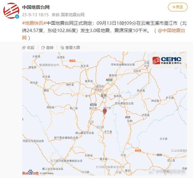 云南玉溪市澄江市發(fā)生3.0級(jí)地震,震源深度10千米