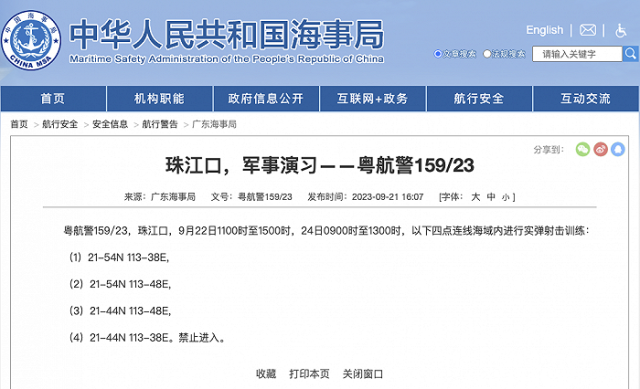 央視網(wǎng)消息:據(jù)中國(guó)海事局網(wǎng)站消息,廣東海事局發(fā)布航行警告,9月22日11時(shí)至15時(shí),24日9時(shí)至13時(shí),珠江口部分海域進(jìn)行實(shí)彈射擊訓(xùn)練,禁止進(jìn)入。