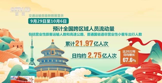 交通運(yùn)輸部最新數(shù)據(jù)顯示,9月29日至10月6日預(yù)計(jì)全國跨區(qū)域人員流動量(包括營業(yè)性旅客運(yùn)輸人數(shù)和高速公路、普通國省道非營業(yè)性小客車出行人數(shù))累計(jì)21.97億人次,日均約2.75億人次,比2022年日均增長67.6%。
