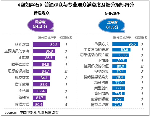 張藝謀導(dǎo)演新作《堅(jiān)如磐石》獲得觀眾滿意度評(píng)分84.1分,居2023年國慶檔調(diào)查五部影片首位,作為聚焦反腐反黑的警匪題材影片,對于社會(huì)現(xiàn)實(shí)以及人性的描摹深度和豐富層次得到了觀眾的高度好評(píng),思想性得分85.4分,為三大指數(shù)中最高,觀賞性得分84.4分,為檔期最高分,其中主要演員的表演得到了不同觀眾的高度評(píng)價(jià),在2023年調(diào)查的50部影片中分別居普通觀眾評(píng)價(jià)的第6位和專業(yè)觀眾評(píng)價(jià)的第3位。
