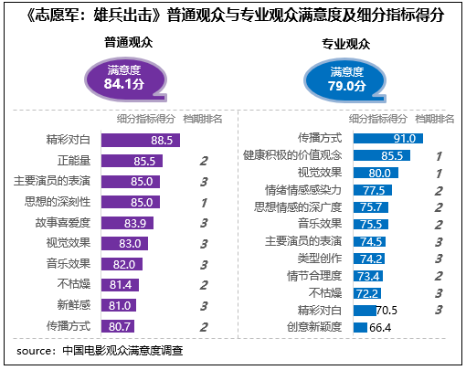 陳凱歌執(zhí)導(dǎo)的抗美援朝題材影片《志愿軍:雄兵出擊》觀眾滿意度83.8分,影片主題立意與國慶氛圍貼合,思想性得分85.0分,影片全景式呈現(xiàn)抗美援朝歷史,所傳遞的愛國精神和英雄氣概震撼人心,有85%的受訪觀眾表示在觀賞影片后感動(dòng)不已。
