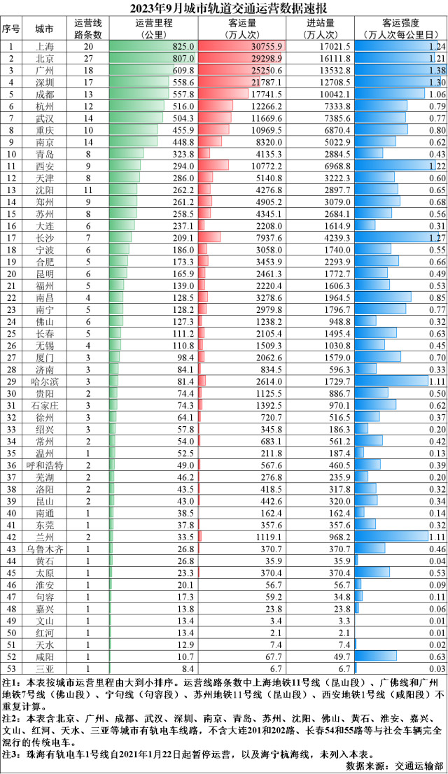 2023年9月,31個?。ㄗ灾螀^(qū)、直轄市)和新疆生產建設兵團共有55個城市開通運營城市軌道交通線路299條,運營里程9859.5公里,實際開行列車318萬列次,完成客運量24.9億人次,進站量14.9億人次。9月份,客運量環(huán)比減少2.2億人次、降低8.2%,同比增加7.1億人次、增長40%,較2019年月均客運量增加5億人次、增長24.9%。9月份客運強度平均水平為0.536萬人次每公里日,較2019年全年客運強度平均水平降低1.8%。