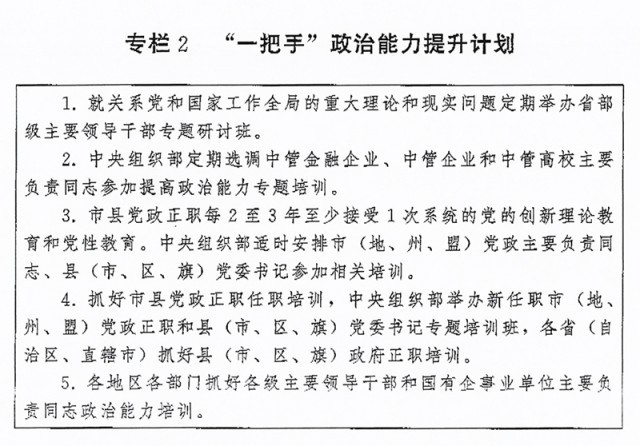 ?。ǘ┩怀觥瓣P(guān)鍵少數(shù)”政治訓(xùn)練。堅(jiān)持把政治訓(xùn)練貫穿干部成長(zhǎng)全周期,使干部的政治素養(yǎng)、政治能力與擔(dān)負(fù)的領(lǐng)導(dǎo)職責(zé)相匹配。強(qiáng)化“一把手”政治培訓(xùn),有計(jì)劃地選調(diào)地方、部門、國(guó)有企事業(yè)單位主要負(fù)責(zé)同志到黨校(行政學(xué)院)、干部學(xué)院參加專題培訓(xùn)。實(shí)施“一把手”政治能力提升計(jì)劃(專欄2)。省(自治區(qū)、直轄市)、市(地、州、盟)、縣(市、區(qū)、旗)黨政領(lǐng)導(dǎo)班子成員每2至3年到黨校(行政學(xué)院)、干部學(xué)院至少接受1次系統(tǒng)的黨的創(chuàng)新理論教育和黨性教育,5年內(nèi)累計(jì)不少于2個(gè)月。圍繞提高政治能力和領(lǐng)導(dǎo)能力,加強(qiáng)機(jī)關(guān)司局長(zhǎng)、處長(zhǎng)任職培訓(xùn)。重視對(duì)女干部、少數(shù)民族干部、黨外干部等的政治培訓(xùn)。加強(qiáng)對(duì)高層次人才的政治引領(lǐng),中央組織部會(huì)同有關(guān)單位每年組織一定數(shù)量人才開展國(guó)情研修。