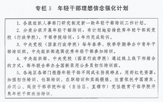 (三)加強(qiáng)年輕干部政治訓(xùn)練。強(qiáng)化習(xí)近平新時(shí)代中國(guó)特色社會(huì)主義思想學(xué)習(xí)教育,突出政治忠誠(chéng)教育、理想信念教育、紀(jì)律規(guī)矩教育,加強(qiáng)優(yōu)良傳統(tǒng)作風(fēng)和責(zé)任感使命感教育,強(qiáng)化斗爭(zhēng)意識(shí),綜合運(yùn)用理論講授、政策解讀、案例教學(xué)、現(xiàn)場(chǎng)體驗(yàn)等方式開展系統(tǒng)培訓(xùn)。黨委(黨組)負(fù)責(zé)同志要講好“開班第一課”。安排思想政治素質(zhì)過硬、理論水平較高、實(shí)踐經(jīng)驗(yàn)豐富的領(lǐng)導(dǎo)干部上講臺(tái)授課。探索推行“政治輔導(dǎo)員”、“導(dǎo)師幫帶”制度。通過開展黨性分析、實(shí)踐鍛煉、過“政治生日”、重溫入黨誓詞等方式,錘煉黨性修養(yǎng)、提高政治覺悟。實(shí)施年輕干部理想信念強(qiáng)化計(jì)劃(專欄3)。