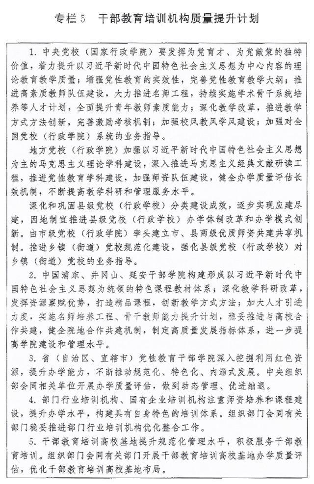 (一)培訓(xùn)機(jī)構(gòu)建設(shè)。推進(jìn)各級(jí)黨校(行政學(xué)院)建設(shè),以教學(xué)督導(dǎo)、師資培養(yǎng)、質(zhì)量評(píng)估為重點(diǎn),強(qiáng)化上級(jí)黨校(行政學(xué)院)對(duì)下級(jí)黨校(行政學(xué)院)的業(yè)務(wù)指導(dǎo),不斷提高辦學(xué)水平。推進(jìn)縣級(jí)黨校(行政學(xué)校)分類建設(shè)。加強(qiáng)社會(huì)主義學(xué)院建設(shè)。進(jìn)一步提升部門行業(yè)培訓(xùn)機(jī)構(gòu)、國(guó)有企業(yè)培訓(xùn)機(jī)構(gòu)辦學(xué)質(zhì)量。加強(qiáng)對(duì)干部教育培訓(xùn)高?;亍⒒鶎痈刹拷逃嘤?xùn)機(jī)構(gòu)辦學(xué)指導(dǎo)。開展黨校(行政學(xué)院)、省(自治區(qū)、直轄市)黨性教育干部學(xué)院、干部教育培訓(xùn)高?;剞k學(xué)質(zhì)量評(píng)估。加強(qiáng)各類黨員干部教育培訓(xùn)機(jī)構(gòu)規(guī)范管理,嚴(yán)控新設(shè)以黨員干部為培訓(xùn)對(duì)象的培訓(xùn)機(jī)構(gòu)。支持地方、部門聯(lián)合開展培訓(xùn),鼓勵(lì)干部教育培訓(xùn)機(jī)構(gòu)開展區(qū)域協(xié)作交流,推動(dòng)優(yōu)質(zhì)培訓(xùn)資源共享。實(shí)施干部教育培訓(xùn)機(jī)構(gòu)質(zhì)量提升計(jì)劃(專欄5)。