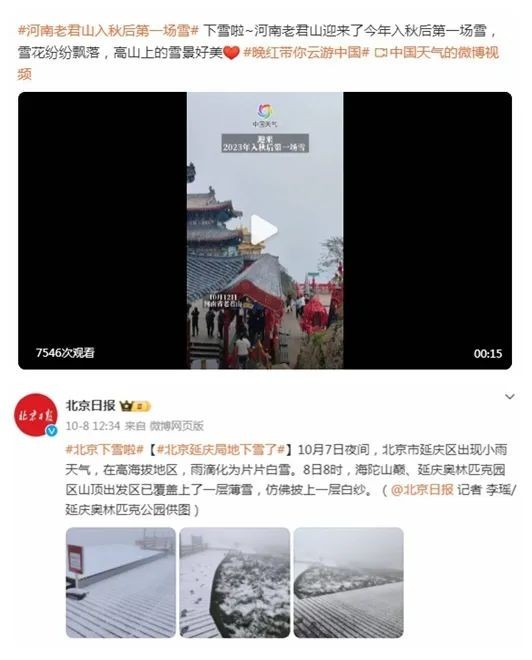 而在此之前,河南老君山就已經(jīng)迎來了入秋以來的第一場雪,甚至在北京延慶的高海拔山區(qū)也迎來了降雪。