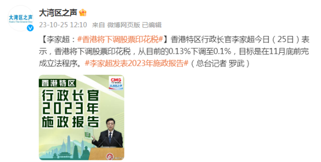 香港特區(qū)行政長官李家超今日(25日)表示,香港將下調(diào)股票印花稅,從目前的0.13%下調(diào)至0.1%,目標是在11月底前完成立法程序。(總臺記者 羅武)