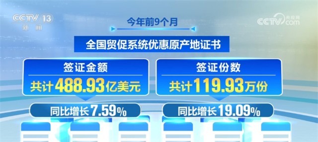 數據顯示,今年前9個月,全國貿促系統(tǒng)累計簽發(fā)原產地證書、ATA單證冊、商事證明書等各類證書455.06萬份,較上年同比增長13.39%。