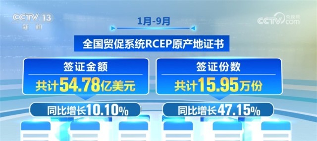 1月—9月,全國貿促系統(tǒng)RCEP原產地證書簽證金額共計54.78億美元,同比增長10.10%;簽證份數共計15.95萬份,同比增長47.15%。
