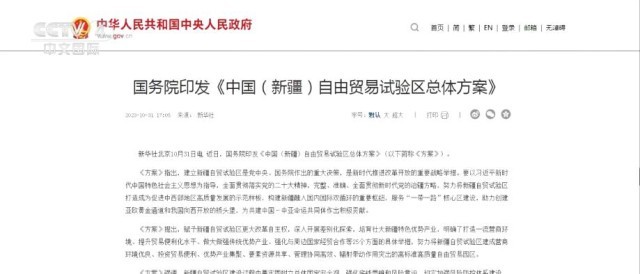 在自貿(mào)試驗(yàn)區(qū)建設(shè)十周年之際,國(guó)務(wù)院印發(fā)《中國(guó)新疆自由貿(mào)易試驗(yàn)區(qū)總體方案》,這是中國(guó)第22個(gè)自貿(mào)試驗(yàn)區(qū)。今天(11月1日),商務(wù)部召開(kāi)專題發(fā)布會(huì),介紹新疆自貿(mào)區(qū)建設(shè)相關(guān)情況。