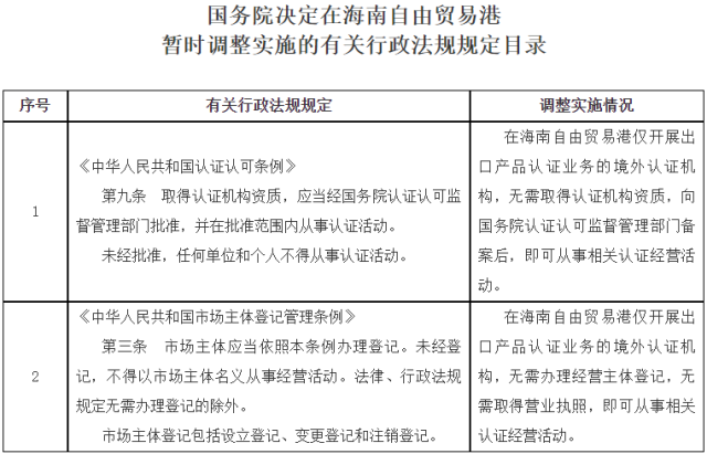 一、為支持海南自由貿(mào)易港建設(shè),按照《海南自由貿(mào)易港建設(shè)總體方案》,同意自即日起在海南自由貿(mào)易港暫時(shí)調(diào)整實(shí)施《中華人民共和國(guó)認(rèn)證認(rèn)可條例》《中華人民共和國(guó)市場(chǎng)主體登記管理?xiàng)l例》有關(guān)規(guī)定(目錄附后),在海南自由貿(mào)易港僅開展出口產(chǎn)品認(rèn)證業(yè)務(wù)的境外認(rèn)證機(jī)構(gòu),無需取得認(rèn)證機(jī)構(gòu)資質(zhì)和辦理經(jīng)營(yíng)主體登記,向國(guó)務(wù)院認(rèn)證認(rèn)可監(jiān)督管理部門備案后,即可開展出口產(chǎn)品認(rèn)證業(yè)務(wù),認(rèn)證結(jié)果僅限出口企業(yè)境外使用。備案條件和程序由國(guó)務(wù)院認(rèn)證認(rèn)可監(jiān)督管理部門制定。
