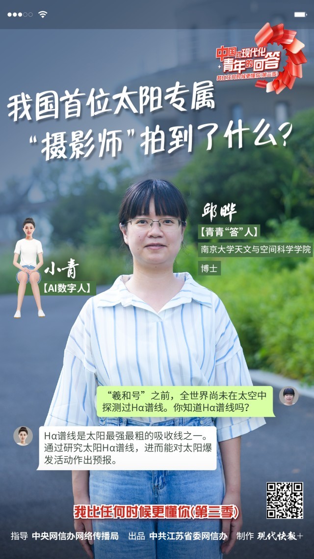 11月7日,“中國(guó)式現(xiàn)代化·青年的回答——我比任何時(shí)候更懂你(第三季)”系列短視頻之《我國(guó)首位太陽專屬“攝影師”拍到了什么?》正式上線。本集視頻中,青青“答”人——南京大學(xué)天文與空間科學(xué)學(xué)院博士邱曄和AI數(shù)字人小青,為大家展示了我國(guó)首顆探日衛(wèi)星“羲和號(hào)”拍攝到的畫面,解釋了“羲和號(hào)”超長(zhǎng)全稱里的兩個(gè)關(guān)鍵詞的含義。