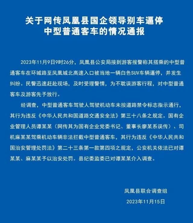央視網(wǎng)消息:據(jù)鳳凰融媒微信公眾號(hào)消息,11月15日,鳳凰縣聯(lián)合調(diào)查組發(fā)布情況通報(bào),經(jīng)調(diào)查,中型普通客車駕駛?cè)笋{駛機(jī)動(dòng)車未按道路禁令標(biāo)志指示通行,其行為違反相關(guān)規(guī)定。國(guó)有企業(yè)管理人員譚某某 (網(wǎng)傳其為國(guó)有企業(yè)黨委書記、董事長(zhǎng)廖某系誤傳)、司機(jī)麻某某駕乘機(jī)動(dòng)車輛非法攔截中型普通客車,其行為違反相關(guān)規(guī)定,公安機(jī)關(guān)依法已對(duì)譚某某、麻某某予以治安處罰??h紀(jì)委監(jiān)委已對(duì)譚某某介入調(diào)查。