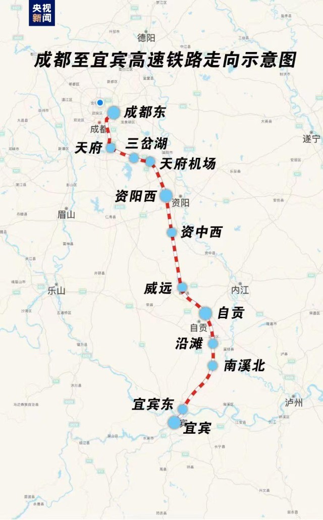 成都至宜賓高速鐵路由新建成都東至宜賓東高速鐵路(以下簡稱“成宜高鐵”)和新建重慶至昆明高速鐵路宜賓東至宜賓(以下簡稱“渝昆高鐵宜賓段”)組成。線路北起成宜高鐵成都東站,止于渝昆高鐵宜賓站。成都至宜賓高速鐵路為雙線高速鐵路,全線共設(shè)成都東、天府、三岔湖、天府機場、資陽西、資中西、威遠、自貢、沿灘、南溪北、宜賓東、宜賓等12個車站,其中成都東和自貢站為既有站,天府站為緩開站。
