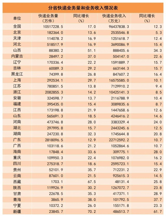1-10月,同城快遞業(yè)務(wù)量累計(jì)完成108.3億件,同比增長2.7%;異地快遞業(yè)務(wù)量累計(jì)完成919.2億件,同比增長18.2%;國際/港澳臺(tái)快遞業(yè)務(wù)量累計(jì)完成24.2億件,同比增長55.1%。