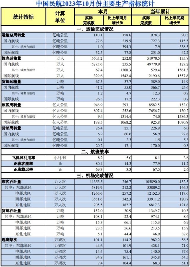 民航局11月20日發(fā)布10月份主要生產(chǎn)指標(biāo)統(tǒng)計顯示,今年10月,運輸總周轉(zhuǎn)量達(dá)到110.1億噸公里,同比增長158.6%;中國民航旅客運輸量達(dá)到5605.2萬人,同比增長252%;10月貨郵運輸量為67.5萬噸,同比增長37.7%。