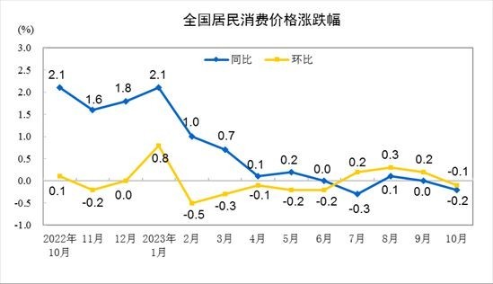 國(guó)家統(tǒng)計(jì)局?jǐn)?shù)據(jù)顯示,2023年10月,全國(guó)CPI環(huán)比下降0.1%,同比下降0.2%,同比時(shí)隔兩個(gè)月后再度出現(xiàn)負(fù)增長(zhǎng)。