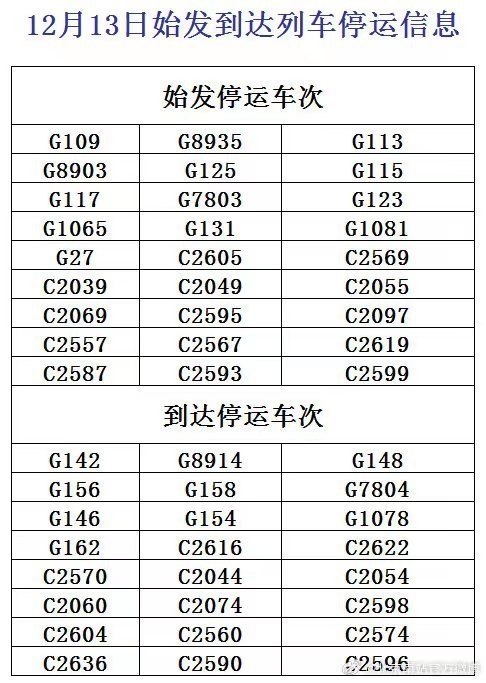 據(jù)北京西站官方微博今天中午最新消息,受降雪影響,12月13日,北京西站G57、G807、G97次列車臨時(shí)停運(yùn),北京豐臺(tái)站G63、G629次列車臨時(shí)停運(yùn)。今天早上,北京西站、北京豐臺(tái)站已發(fā)布部分停運(yùn)列車信息。已購買停運(yùn)列車車票的旅客,可于30日內(nèi)辦理全額退票手續(xù)。請(qǐng)廣大旅客合理安排出行,關(guān)注車站公告或12306網(wǎng)站信息。