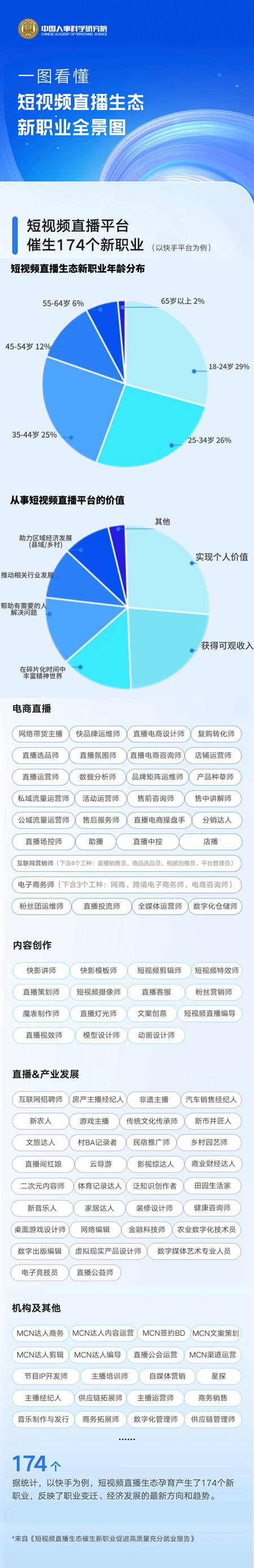 中國人事科學(xué)研究院近期發(fā)布的《短視頻直播生態(tài)催生新職業(yè)促進(jìn)高質(zhì)量充分就業(yè)報告》顯示,一塊屏幕背后發(fā)生了諸多變化:中青年成短視頻直播生態(tài)新職業(yè)的主力軍。其中,18-24歲占29%,25-34歲占26%,35-44歲占25%。18-34歲占比達(dá)到55%?!吨腥A人民共和國職業(yè)分類大典(2022年版)》的1639個職業(yè)中,短視頻平臺快手覆蓋八成以上的數(shù)字職業(yè),為勞動者提供了更廣闊的職業(yè)發(fā)展空間。