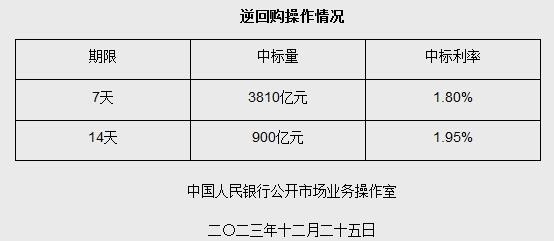 中新網(wǎng)12月25日電 據(jù)央行網(wǎng)站消息,為維護年末流動性合理充裕,2023年12月25日人民銀行以利率招標方式開展了4710億元7天期和14天期逆回購操作。具體情況如下: